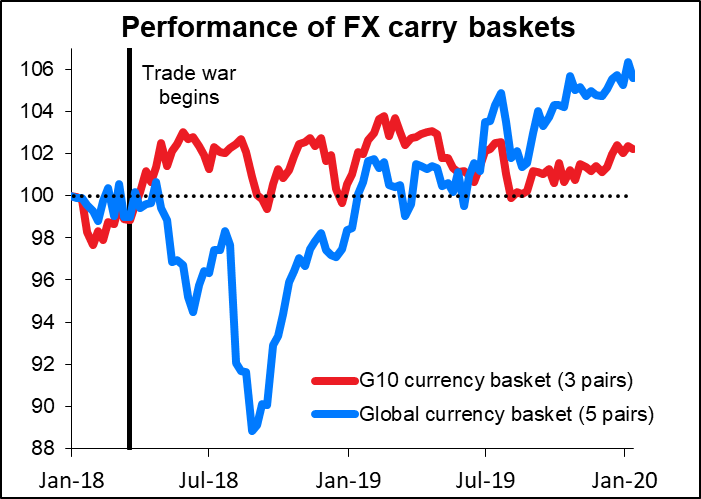 Was die Carry Trades betrifft, so gab es in den letzten zwei Jahren unter den G10-Währungen wenig zu tun, da die Geldpolitik konvergiert und die Volatilität sinkt. Erfolgreicher waren jedoch die EM-Carry-Trades. EM-Carry-Trades könnten in Zukunft noch profitabler sein, wenn, wie ich erwarte, die EM-Währungen von einer Verbesserung der Welthandelsaussichten profitieren.