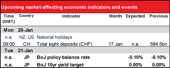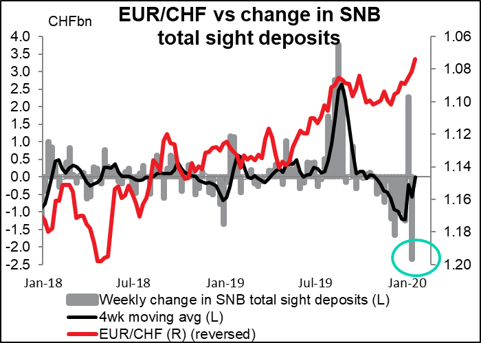 I put the Swiss sight deposits in the calendar because Switzerland was recently cited in the semi-annual US Treasury report on currency manipulators. The Swiss National Bank argued that it was well within its rights to intervene in the FX market. Traders will want to see if it’s really keeping up. The figures were as of 17 January (Friday), and the report was released on 13 January (Monday), so the SNB had time to react to the report. Their intervention is to a large degree a response to what the market does, and the market pushed CHF up strongly in response to the Treasury report, so it will be interesting to see whether they continued intervening, next week as well as this week. In the previous week, sight deposits actually fell despite the continued appreciation of CHF vs EUR, so it’s clear that there’s more going on here than just knee-jerk reactions.
