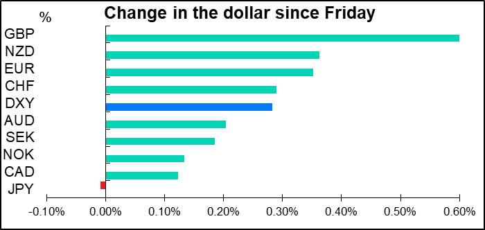 The dollar is stronger all around this morning, except vs JPY. USD rose on Friday after US housing starts beat expectations and US stock markets moved further into record territory.