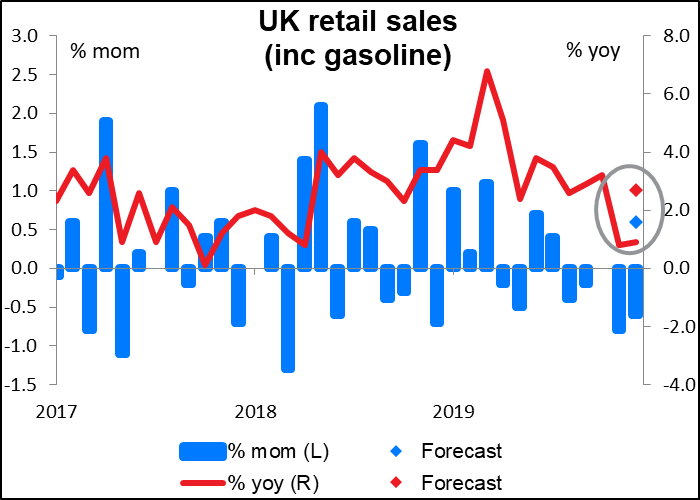 The BoJ may well upgrade its FY2020 growth forecast from October’s 0.7% rate as a result of the fiscal stimulus package that the government announced in December. Since that forecast was already above the BoJ’s estimate for Japan’s potential growth rate of 0.57%, they are likely to stick with their view that the output gap is expanding gradually and inflation should eventually move back towards their 2% target. (Good luck with that! is my personal view, and the view of the market too, but they have to retain a show of confidence in their hopeless quest.) Japan’s national inflation data comes out on Friday, but this is of less interest ever since they started announced the Tokyo figures about two weeks before the national figures.