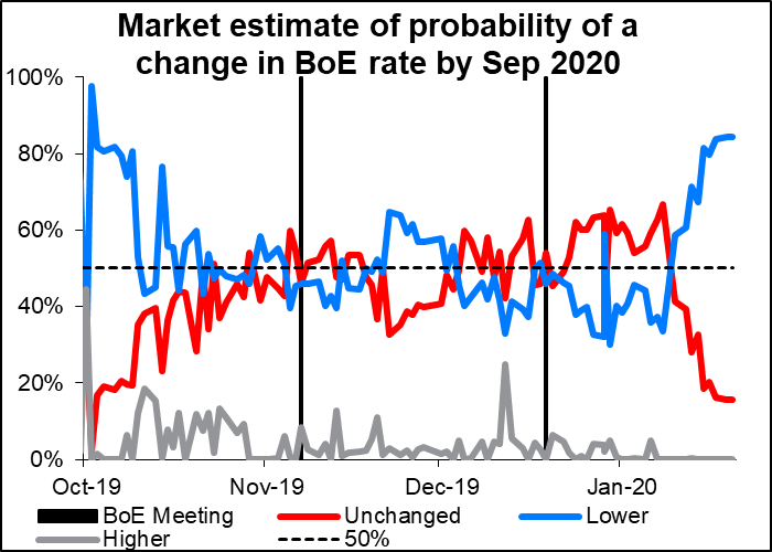 As you can see, the market’s estimate of the likelihood of a rate cut this year has increased dramatically. Adding economic distress to the divisive politics of Brexit and the difficult trade negotiations ahead is a recipe for disaster for sterling. We await Friday’s preliminary purchasing managers’ indices (PMIs) for sterling with some trepidation (especially as in my case, I’m waiting to collect some GBP from various banks that owe me money and watching it depreciate in value every day).