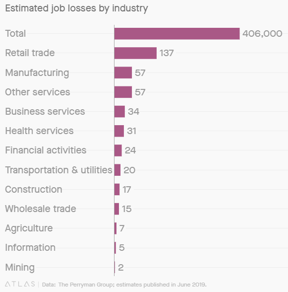 What is worse, more than 50,000 jobs could disappear from the manufacturing industry, the sector that Trump has promised to prop up in part through his aggressive trade agenda.