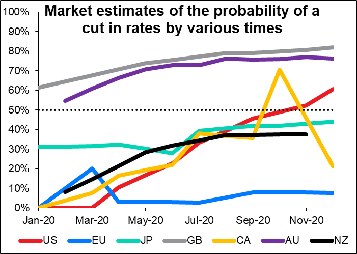 Interesting move today – both JPY and AUD lost about the same ground vs USD. This suggests that the “risk-on, risk-off” pattern is fading. Perhaps we’re seeing a return to fundamentals? Or perhaps the fear of further trade wars is fading (hence a weaker USD), but at the same time, people are reevaluating the possible boost to come from the settlement that we’ve seen so far and are seeing no reason to expect a sudden boom in demand (hence weaker AUD). China’s GDP figure was in line with expectations at +6.0% yoy (surprise, surprise) but industrial production beat estimates handily, accelerating to 6.9% yoy from 6.2% yoy (vs expected slowdown to 5.9%). In theory, better China data would normally be expected to boost AUD. Perhaps it’s a problem with Australia itself right now, in particular the fires and the likelihood of a rate cut.