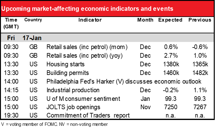 US housing starts are expected to be up, but building permits are forecast to be down from November’s level. Never mind – the surge in November brought the number of permits to a high for this economic cycle. Some mean reversion is only to be expected. The upward trend in the housing market seems to be intact. USD positive
