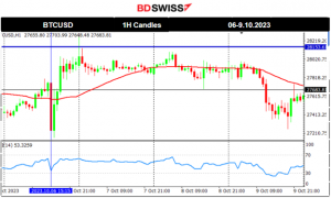 Despite the highly volatile market conditions on Friday during the most important news for the month affecting the USD, the price of bitcoin did not deviate much from the MA. There was a drop at 15:30 but soon after, bitcoin’s price reversed. It continued to move sideways within a range and around the mean. Significant support now is at 27150 and the resistance level at 28200. Yesterday we observed a drop that started during the European session around 10:00. The USD was not the driver of the fall. It found support and remained in range, retracing back to the 30-period MA.