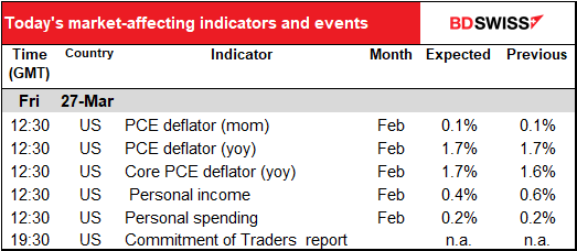The US personal consumption expenditure (PCE) deflator and its sub-index, the core PCE deflator. This, and not the consumer price index, is the Fed’s preferred inflation gauge. They didn’t spell out that they focus on the core PCE deflator, but it’s widely assumed because of various hints they’ve dropped over the years. That’s why I think that under normal circumstances, this is an important indicator. But right now central banks aren’t concerned about inflation or even deflation, they’re concerned about our survival as a species. So this indicator is of only passing interest now.